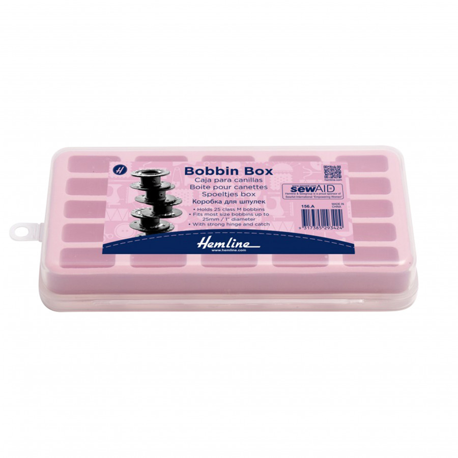Bobbin box with strong hinges and catch for holding 25 class M bobbins. Fits most size bobbins up to 25mm/1in diameter. Box dimensions: 19 x 9.5 x 3cm (7.5 x 3.75 x 1.2in). Bobbins not included.