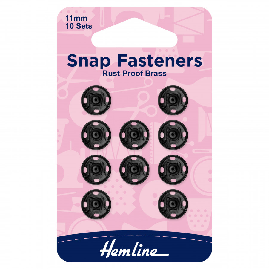 Sew-on, rustproof brass snap fasteners. Quick and easy to attach, ideal for sewing projects around the home. Central guide holes in both top and bottom assist perfect alignment when fitting. Black, 10 sets – 11mm, 0.5in.