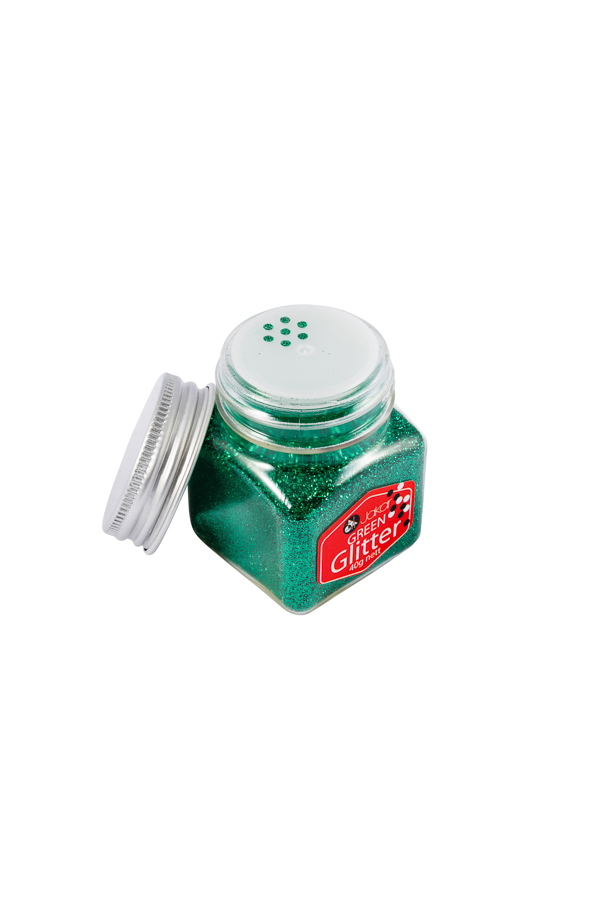 Glitter, fine, non-toxic, polyester (1/128″). Supplied 40 grams per square plastic container (44 x 44 x 60mm) with metal screw cap and sprinkler top.