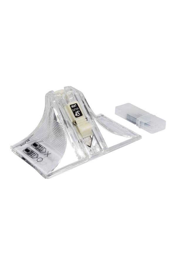 Mount cutter with two angles, 45° and 90° for use with Jakar Mount Cutter Ruler (7322). Contains two blades plus three spares. Cuts materials up to 7mm thick