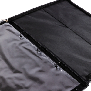 A portfolio case with ring binders. With rigid PVC water proof cover, black zip, expandable handle, two internal pockets and zinc alloy spring binder.