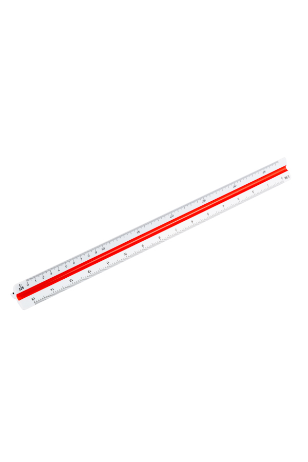 300mm high impact polystyrene, white edges, coloured furrows. Scales: 1:2.5, 1:1.5, 1:10, 1:20, 1:50, 1:100. Supplied in a transparent box.