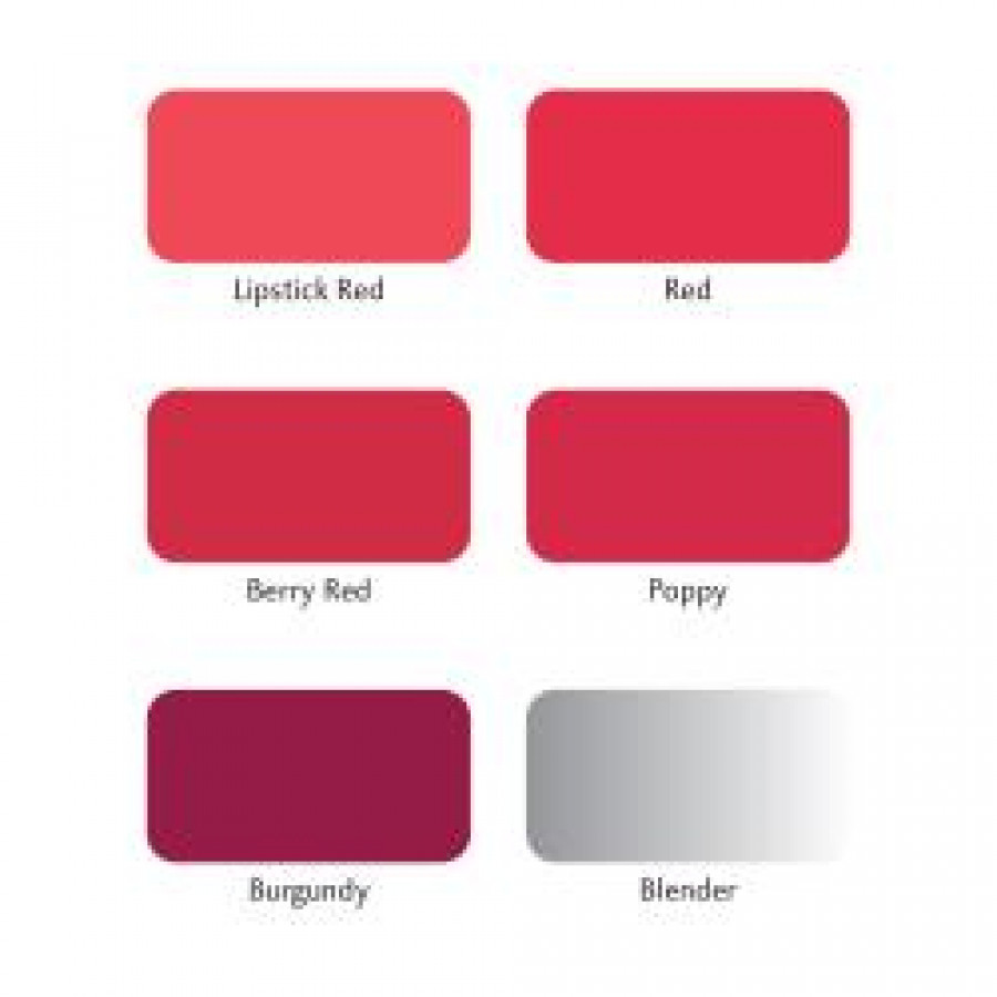 Includes: Lipstick Red (R576), Red (R666), Berry Red (R665), Poppy Red (R565), Burgundy (R424) and a Blender (BL).