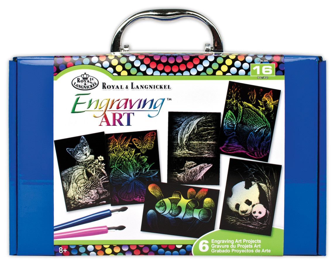 Royal Brush-Engraving Art Kit. Create detailed works of art with this fun and easy to use kit! This package contains six engraving boards with a different design on each six practice pieces two srapecutters and instructions within one 6×9-3/4×3 inch box with handle. Suitable for children 8+