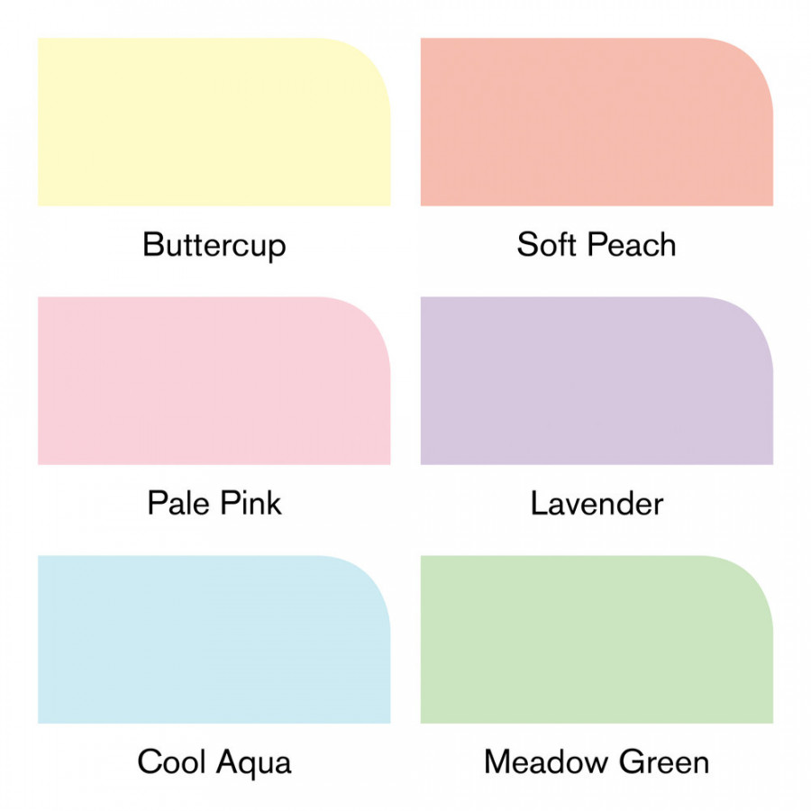 The Pastel Tones set includes 6 colours: Buttercup, Soft Peach, Pale Pink, Lavender, Cool Aqua and Meadow Green.