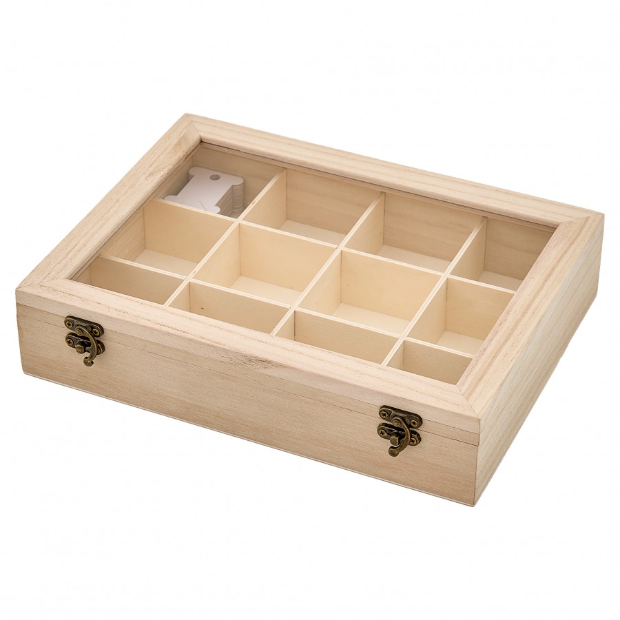 Stay organised and find your threads faster with this practical, easy to view storage box. 12 equally spaced compartments. 50 paper bobbins included. Clear acrylic lid. Paulownia wood. Swing hook clasps.